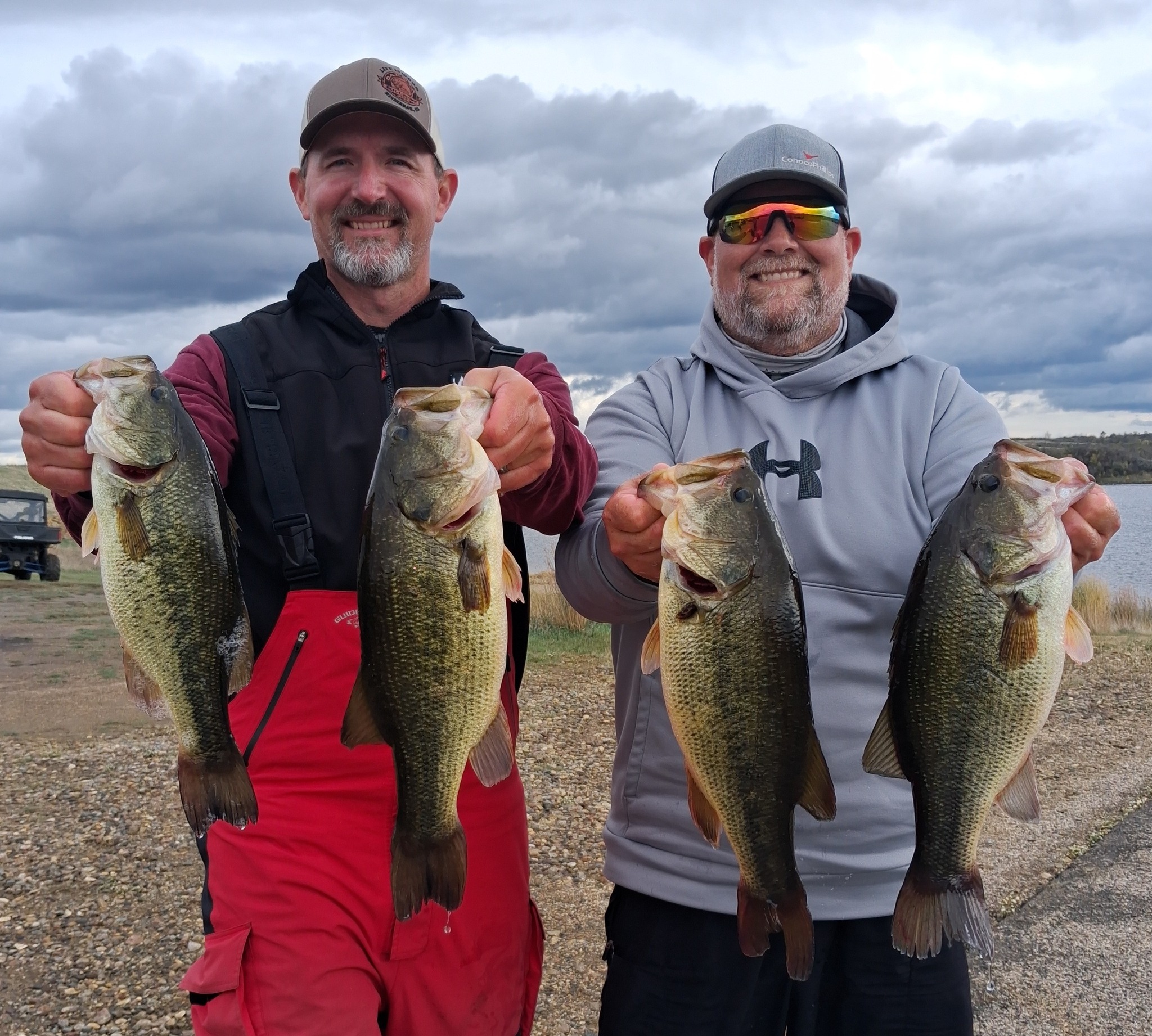 Cody Arth and Justin Enney took first place with an impressive total weight of 10.12 pounds, including a big bass weighing 2.25 pounds. Their consistent catch of five fish earned them a perfect 100 points. Close behind, Jeff Peck and Jon Hopson secured second place with a weight of 10.1 pounds and a big bass of 2.08 pounds, scoring 99 points. Dustin, Kolbe, and Lukas Baker rounded out the top three with 9.79 pounds and a big bass of 2.3 pounds, earning 98 points.