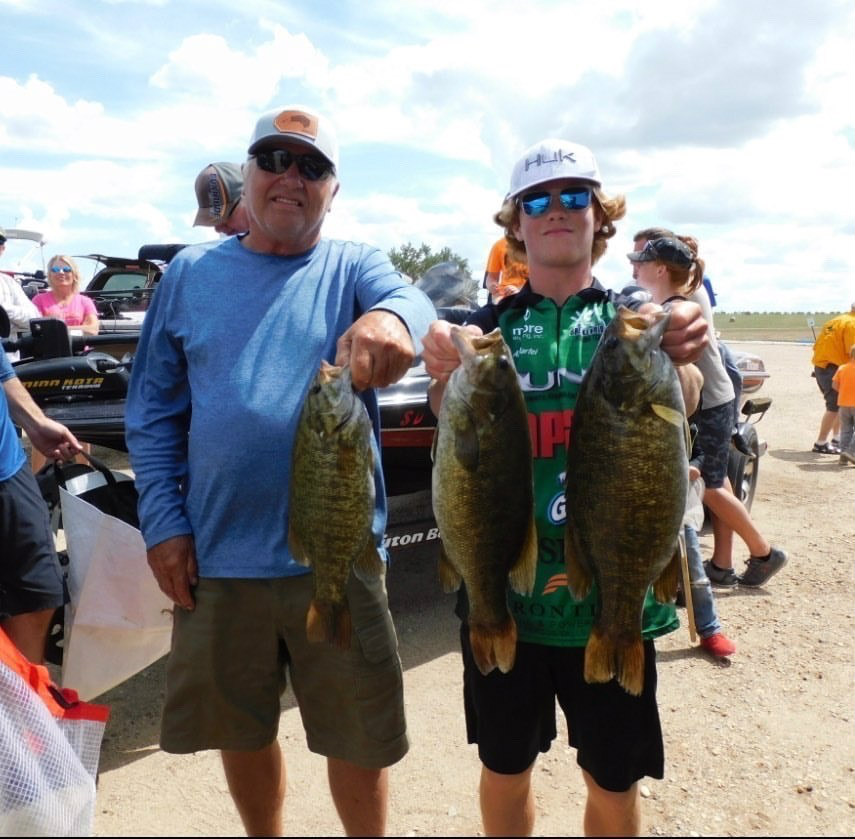 Coming in first place was Justin & Cami Enney with 12.07 pounds for their largest three. Only a half-pound behind was Tony McKay and Ty Gray with 11.48 pounds and right on their tails in third was Willie Kist and Matt Knutson with 11.42 pounds! But the most entertaining catch of the day was Alex Martel who brought in the biggest bass of the tournament at 4.79 pounds. With only minutes to conclude the tournament before boats loaded up for weigh in, Alex and his father Dan continued to fish in the canal only 200 yards from the ramp to try and catch their third fish to round out their limit. At 2:28 and two minutes left to fish Alex hooks up with a hog of a smallmouth and Dan does and excellent net job and they land a giant 4.79 pound smallie, so big that it makes second largest to be caught on our New John’s events, congratulations Alex on your awesome catch!